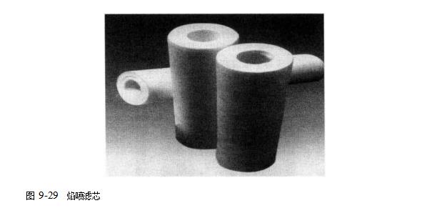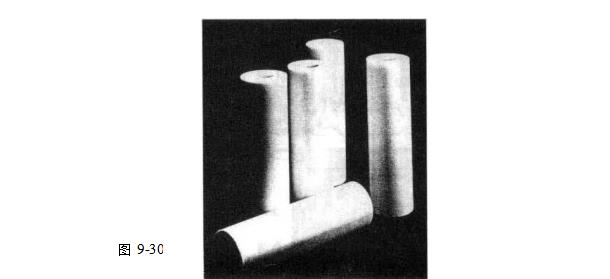 聚乙烯醇與其他可熔解材料混合成型,可熔材料最終成為氣孔生成模型劑,后經(jīng)水沖洗模型劑并使其化學(xué)反應(yīng),使PVA硬化成為多孔性濾筒(圖9-30)工業(yè)過程要掌握好氣孔、模型劑的粒度,這是確定過濾精度的關(guān)鍵.